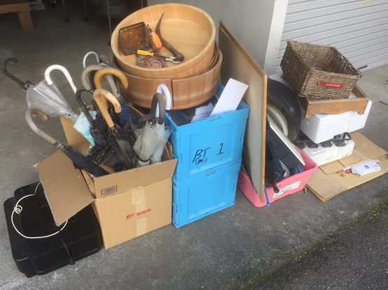 倉庫前にダンボール箱や傘、桶、雑貨などがまとまって置かれた状態でした。スペースの一角が不用品で埋まっており、出入りがしにくい状況でした。